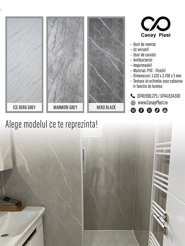 • Ușor de montat • Uz versatil • Ușor de curățat • Antibacterial • Impermeabil • Material: PVC – flexibil • Dimensiuni: 1.220 x 2.700 x 3 mm • Textura își schimbă ușor culoarea în funcție de lumină